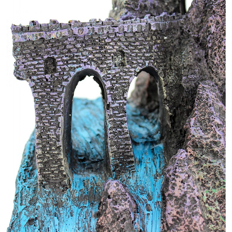 Esta decoración de acuario cuenta con un gran castillo gris posado sobre una colina rocosa con una cascada que fluye debajo. El techo, arcos y detalles de piedra en forma de cono dan una sensación realista.