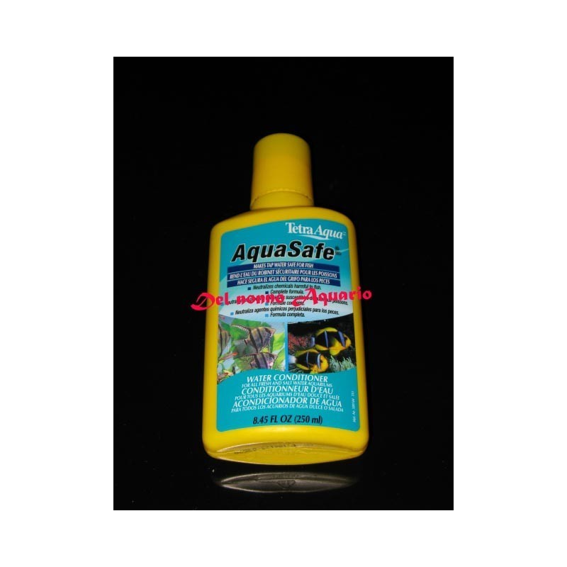 Acondicionador de agua Tetra AquaSafe, elimina cloro, cloramina y metales pesados de forma instantánea. Fomenta además el desarrollo de la mucosa protectora de los peces. Rendimiento aproximado de 1893 litros. Presentación en envase de 250ml./ Origen: Alemania