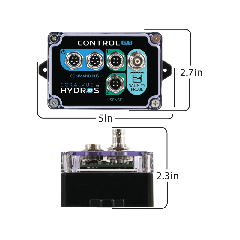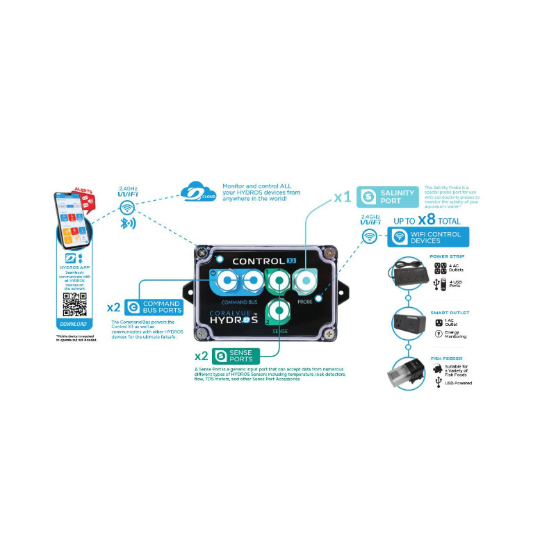 El HYDROS Control X3 se puede conectar a dos sensores, incluyendo sensores de temperatura, sensores de nivel de agua y detectores de fugas. El dispositivo también incluye un puerto de sonda para monitorear los niveles de pH u ORP. El Control X3 puede enviar alertas y notificaciones, y controlar salidas para luces, bombas, comederos y más. Puede usarse como controlador independiente para acuarios de agua salada, tanques de agua dulce y estanques, o puede combinarse con otros controles HYDROS para crear un sistema más completo. El Control X3 funciona con una red de seguridad HYDROS y cuenta con certificación IP65 para mantener su equipo y la vida acuática en perfectas condiciones. Todos los productos HYDROS se diseñan, ensamblan y reciben soporte técnico en EE. UU.