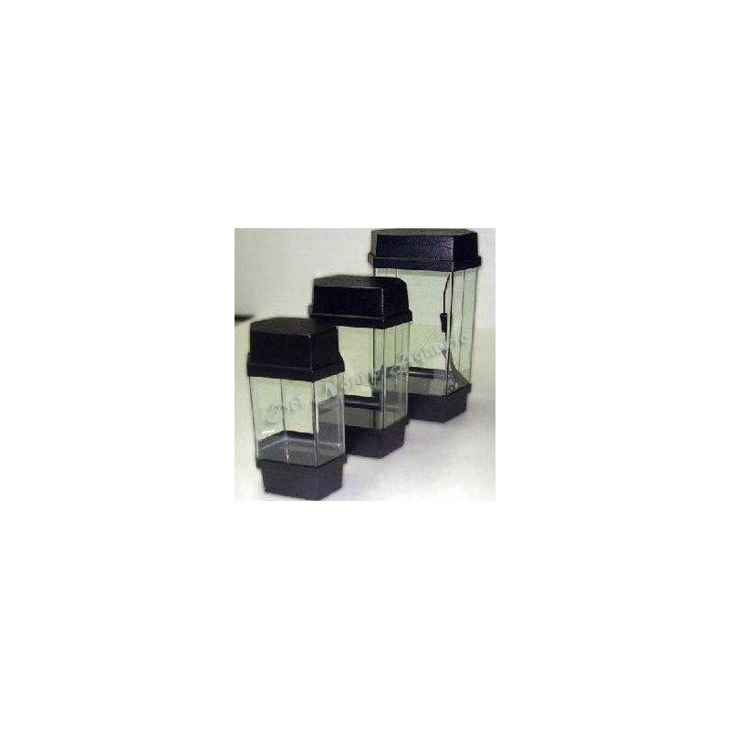 Pecera rectangular modelo Hexagonal. Incluye Base plastica para el apoyo. Iluminacion plastica para lampara y tapa de vidrio interna. Medidas 30 cm de lado y 45 cm de alto