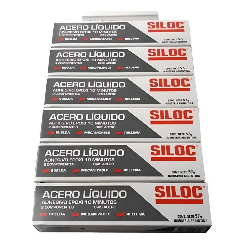 *** EL VALOR PUBLICADO ES POR PACK DE 6 UNIDADES ADHESIVO SILOC ACERO LIQUIDO 57g X 6 UNIDADES •SUPERFICIES APTAS -METALES -CERÁMICA -VIDRIO -PLÁSTICOS -MADERA -PIEDRA -FIBRA DE VIDRIO -CAUCHO -CEMENTO -COMPUESTOS MIXTOS •DESTACADOS -IDEAL PARA REPARAR Y RECONSTRUIR PARTES Y RELLENAR GRIETAS Y FISURAS. -EXCELENTE RESISTENCIA A PRODUCTOS QUÍMICOS, ACEITES, AL CONTACTO E INMERSIÓN EN AGUA. -SOPORTA TEMPERATURAS ENTRE -10°C Y +180°C. -ENDURECE EN 10 MINUTOS. A LAS 2 HS ES 100% MECANIZABLE. -UNA VEZ CURADO PUEDE SER LIMADO, TALADRADO, MECANIZADO Y/O PINTADO. •CONTENIDO -1 COMPONENTE NEGRO -1 COMPONENTE GRIS