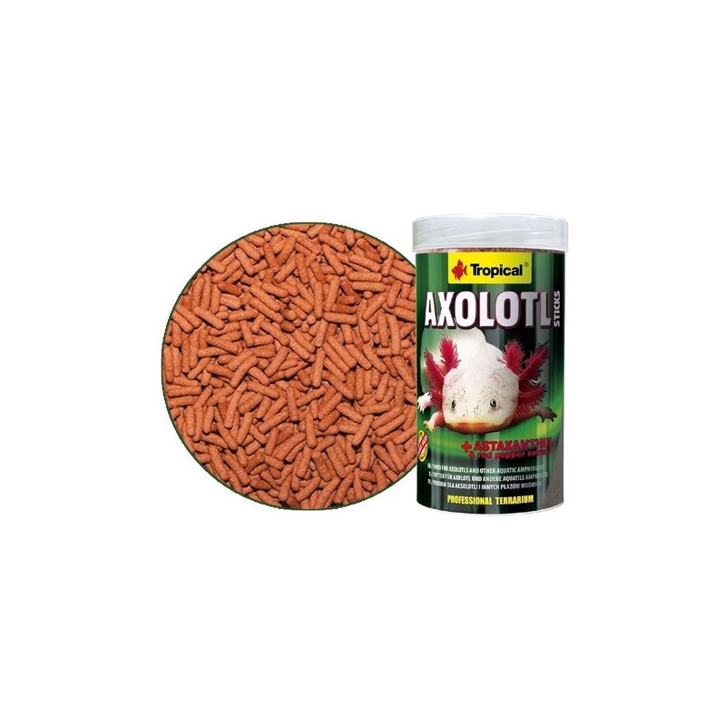 Tropical Axolotl Sticks es un esencial alimento en forma de sticks que se hunden destinados especialmente para especies que generalmente comen carne de animales como el axolote mexicano, el gallipato, la rana africana de uñas, entre otros anfibios acuáticos. Disponible en envase de 250 ml.