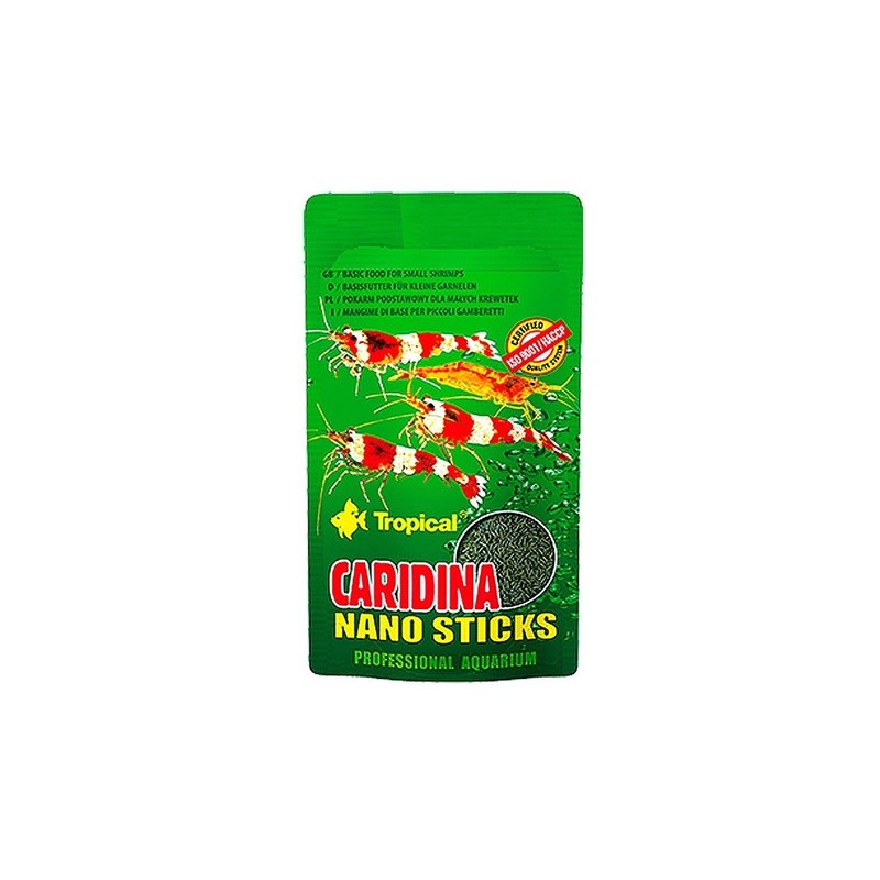 CARIDINA NANO STICKS un alimento básico para gambas pequeñas. Caridina Nano Sticks es un alimento básico, multicomponental en forma de microsticks que hunden destinado para la alimentación diaria de gambas pequeñas (p.ej. Crystal Red) y otros crustáceos de agua, entre otros los marinos. Aplicado regularmente intensifica los colores y favorece los procesos de la muda. Una fórmula seleccionada de manera óptima garantiza una condición perfecta y salud a los crustáceos.