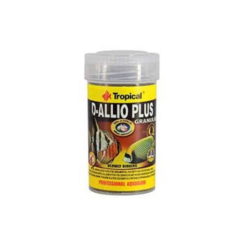 D-ALLIO PLUS GRANULAT un alimento multicomplemental granulado con ajo. Alimento completo en gránulos con un suplemento de ajo (30%) destinado para los discos y otros peces con exigencias alimentarias, también para peces marinos. En la fórmula de D-Allio Plus Granulat se ha utilizado las propiedades del ajo (Allium sativum L.), ya conocidos y respetados desde mucho tiempo. Este complemento natural refuerza los organismos de los peces y favorece los procesos digestivos. Un alto valor nutritivo del alimento, una serie de vitaminas y microelementos seleccionados de la manera óptima y las propiedades del ajo hacen que D-Allio Plus Granulat es un alimento indispensable durante las curaciones, convalecencias de los peces y su aclimatación a las condiciones nuevas. Para variar las dietas de los discos y otros peces exigentes se recomienda la utilización de D-Allio Plus Granulat alternativamente con otros alimentos de la marca Tropical, por ejemplo Regular, D-50 Plus, Astacolor.
