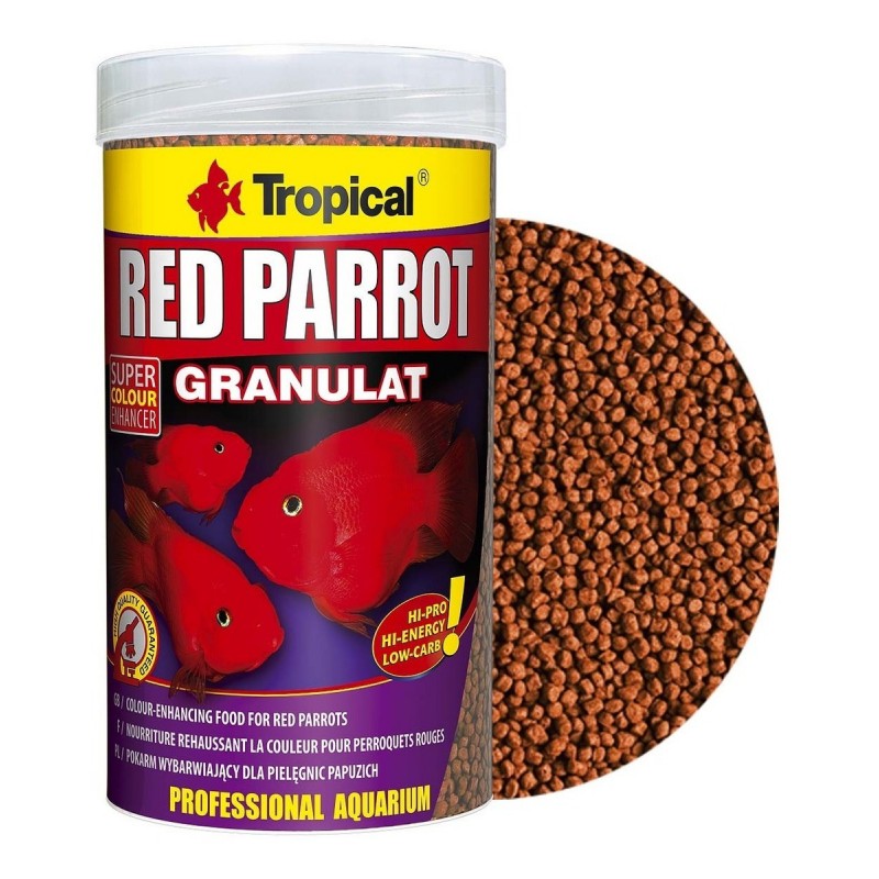 RED PARROT GRANULAT un alimento resaltador del color para Peces Loros. Un granulado resaltador del color para Peces Loros y otros especies de la familia Cichlidae, que en su dieta necesitan un alto contenido de carotenoides que intensifican sus colores. Una resaltación del color eficaz es un resultado de un alto contenido de astaxantina natural (100 mg/kg) que se asimila facilmente y se cumula en cromatóforos. Un alto contenido de ácidos grasos omega-3 y omega-6 refuerza el sistema inmunológico y mantiene los peces en una condición perfecta. La tecnología HTST, aplicada en la producción del granulado, garantiza un gran nivel de asimilación de los componentes nutritivos y seguridad biológica del producto. Una hidroestabilidad especial hace que los gránulos conservan su estructura durante mucho tiempo en el agua, no ensuciándola, ni dejando que los componentes nutritivos importantes se queden en el agua. Gracias al que el granulado flota en el agua, los peces pueden recoger el alimento de su manera natural. Empaquetado en un nuevo tipo de latas transparentes con filtro UV deja ver como es el alimento en realidad. El filtro UV utilizado protege los componentes de la actuación degradante de la luz, garantizando complejidad del alimento.