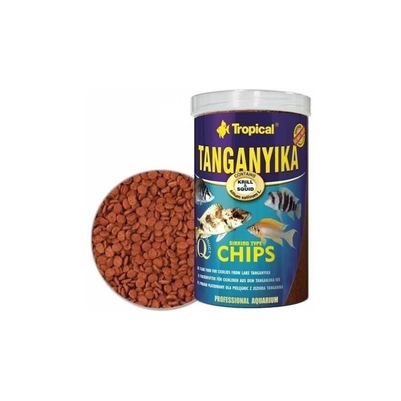 TANGANYIKA CHIPS es un alimento completo y especial en forma de chips para los cíclidos más grandes del Lago Tanganika, incluyendo los de las familias Altolamprologus, Julidochromis, Lamprologus, Neolamprologus, Cyprichromis, Paracyprichromis y también para los peces jóvenes del género Cyphotilapia frontosa y otros, que se alimentan principalmente con los organismos de origen animal. El alimento TANGANYIKA CHIPS contiene 70% de los ingredientes del origen marino, incluyendo los camarones, krill y calamares, cuales son una excelente fuente de las proteínas de muy alta calidad ricas en los aminoácidos exógenos. Gracias al extraordinario sabor de los ingredientes, incluso los peces más exigentes se comen este alimento con muchas ganas y ansiedad. La resistencia a las enfermedades naturales se ve reforzada por sustancias encontradas en la spirulina, las algas Kelp, el ajo y también en la vitamina C estabilizada.