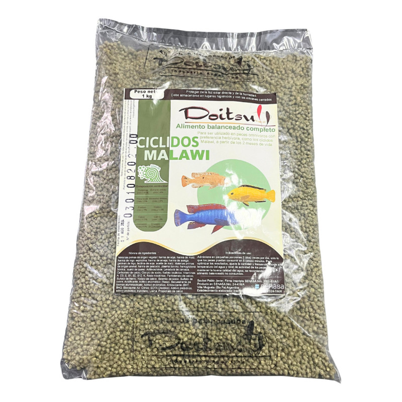 Doitsu Cíclidos Malawi BOLSA DE 1 KG Doitsu Cíclidos Malawi es el alimento de flote para específicamente formulado para darles de comer a los cíclidos herbívoros, africanos como Malawi. Consta de gran aceptación en otros peces con tendencia herbívora en su dieta. Formulado a base de vegetales, espirulina y otras algas. Doitsu Cíclidos Malawi no posee colorantes ni saborizantes artificiales. Rico en vitaminas C y E, con alta digestibilidad. Por su completa y enriquecida composición es un alimento de uso diario para todos los peces herbívoros. Los principales beneficios de utilizar Doitsu Cíclidos Malawi: *Complejo polivitamínico Rico en vitamina C y E; como así también en otras vitaminas y minerales. *Contiene espirulina Contiene espirulina, alga unicelular de alto perfil nutricional, no solo a nivel proteínico sino también como fuente de vitaminas y minerales. *Alimento de uso diario Posee una composición equilibrada permite que sea un balanceado de uso diario. *Alta digestibilidad Posee proteínas de alta calidad y digestibilidad.