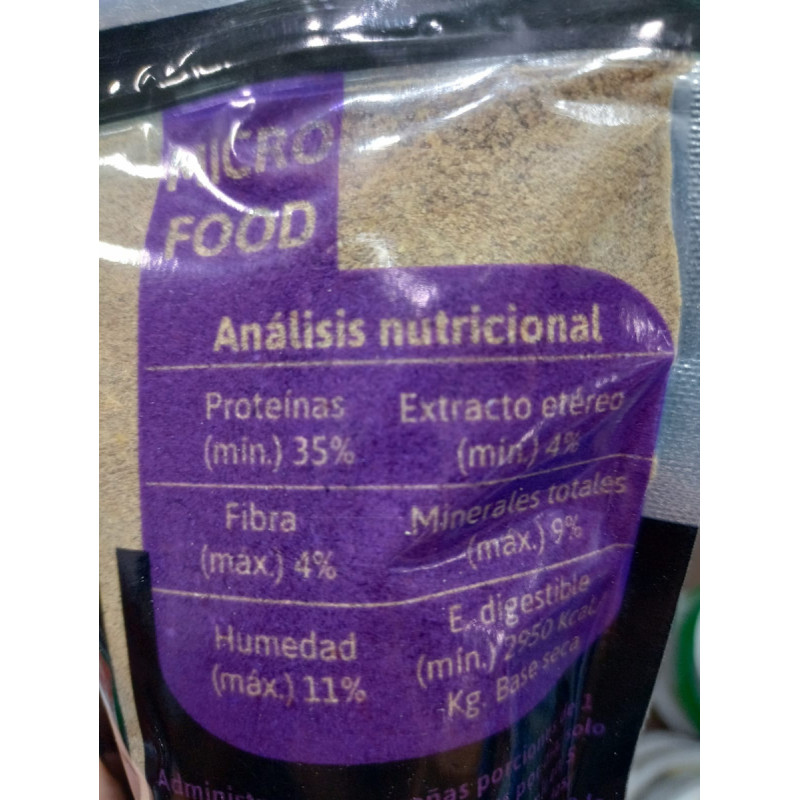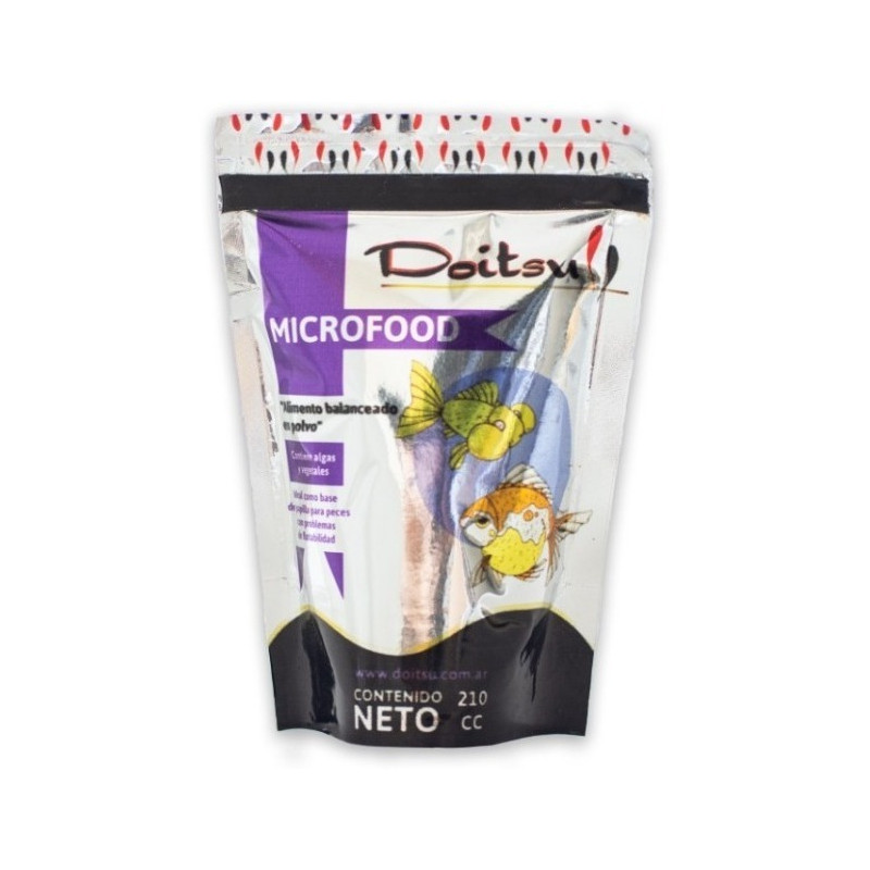 Doitsu Microfood es el alimento balanceado ideal para ser suministrado como alimento inicial a los alevines. A su vez, se lo utiliza como base para papillas equilibradas en minerales, vitaminas y oligoelementos. Doitsu Microfood es fácilmente digerible y goza de gran aceptación entre todas las variedades de carassius, desde las más rústicas hasta las más seleccionadas. Su cuidadosa composición y el valioso complejo multivitamínico resultan idóneos para el cuidado de los peces y sus crías. Esta forma de presentación, posibilita la preparación de papillas, lo cual es ideal para peces con problemas de flotabilidad o bajo tratamiento médico. A su vez, Doitsu Microfood es una alimento completo para alevines. Dado su pequeño tamaño y su alto perfil nutricional, es el balanceado ideal para ser el primer alimento de los peces. Al ser en polvo, el alimento flota varios instantes y comienza a descender lentamente; posibilitando su ingesta tanto para peces en superficie como media y fondo de agua. Los principales beneficios de utilizar Doitsu Microfood Fácil preparación utilizándola como base de papilla. Rápida preparación, en menos de 2 minutos estará lista solo agregando agua y mezclado hasta formar una masa homogénea. No require de heladera la pasta elaborada. No requiere enfriamiento previo, basta con preparar lo necesario para cada comida y lo que sobra puede estar 24hs a temperatura ambiente (sin exposición al sol). Al ser alimento fino en polvo, se convierte en la mejor alternativa como primer alimento para los alevines de pocos días de vida.