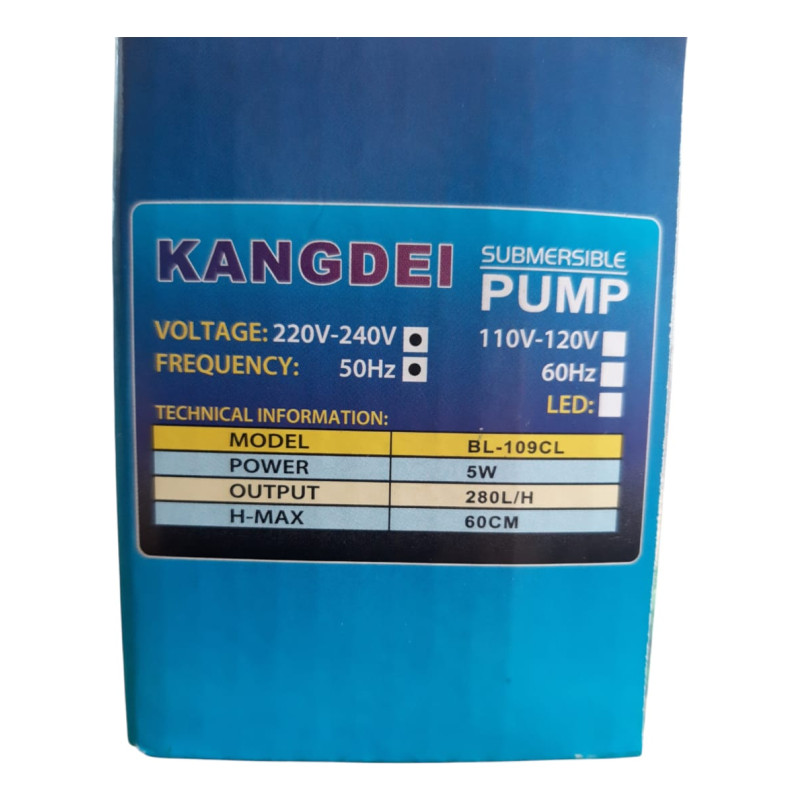 Especificaciones del fabricante: Marca Kangde - Modelo BL-109 - Potencia 5W - Caudal/Salida 250L/H - Elevación máxima aprox. 60 cm - Voltaje 220-240V.