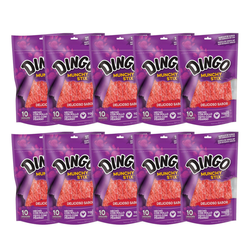 EL VALOR PUBLICADO ES X 10 BLISTER DE 10U CADA UNO NUEVO VENCIMIENTO 2028 ¡Dingo® Munchy Stix ™ son deliciosas delicias que su perro no puede resistir! A los perros les encanta el gran sabor del pollo real, y Dingo Munchy Stix tiene pedacitos de pollo real en cada bocado. ¡Dingo Munchy Stix está hecho con los ingredientes de la más alta calidad para darle a tu perro un bocadillo fácil de masticar que está lleno de sabor! • Sabrosa combinación de pollo real y cuero crudo premium • Dingo Munchy Stix, el cuero crudo del masticador ligero • Mascar sano y divertido para promover dientes limpios de la acción natural de masticar