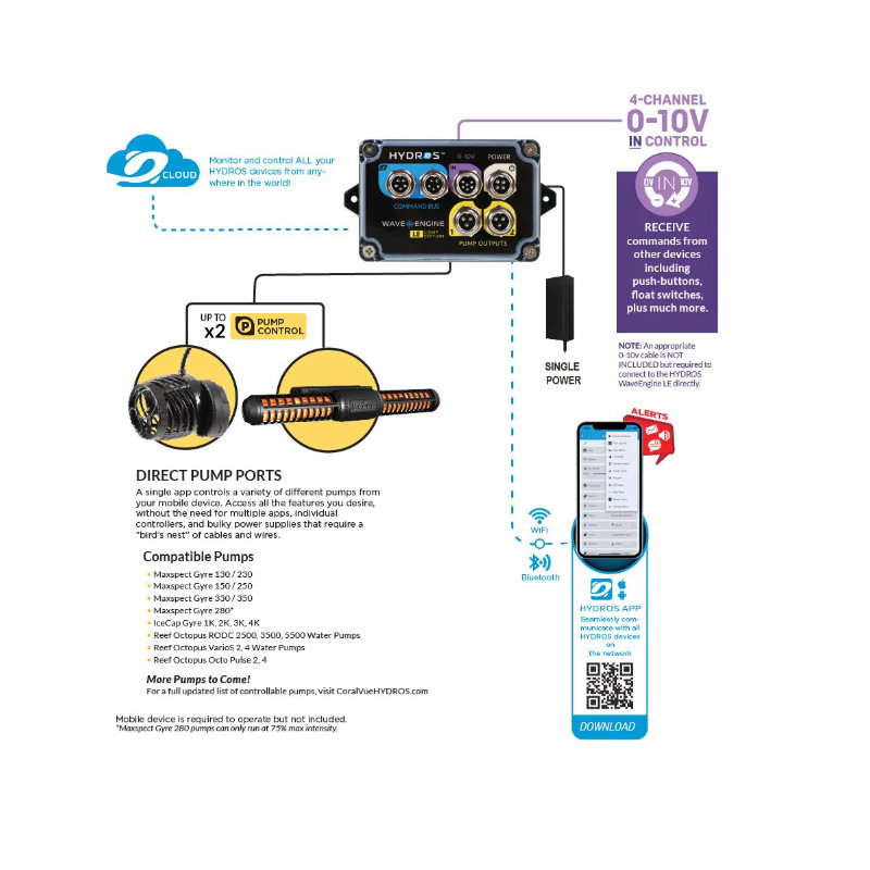 **TENGA EN CUENTA: Se requiere un adaptador de bomba adecuado o un cable de 0 a 10 V (se vende por separado) para conectar las bombas directamente al HYDROS WaveEngine LE.