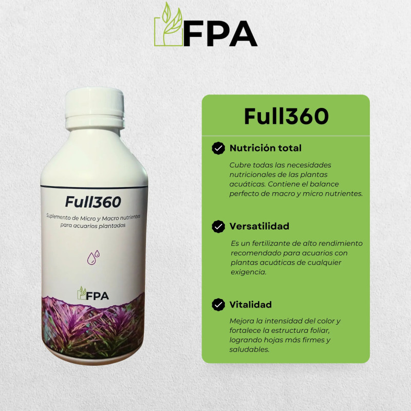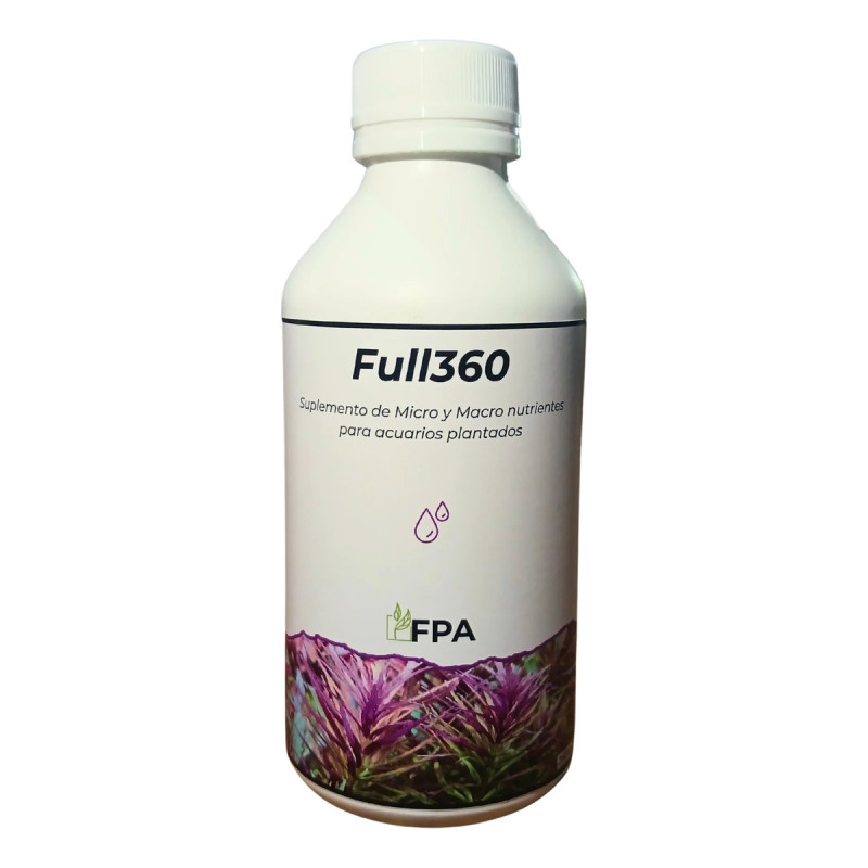 Full360 - Fertilizante completo para acuarios plantados Todo lo que tus plantas necesitan en un solo producto. Full360 es un suplemento de macro y micronutrientes formulado para cubrir todas las necesidades nutricionales de las plantas acuáticas, favoreciendo un crecimiento equilibrado, colores más intensos y una estructura foliar fuerte y saludable. BENEFICIOS -Cubre todas las necesidades nutricionales de las plantas acuáticas. -Contiene el balance perfecto de Nitrogeno, Fosforo y Potasio. -Incluye todos los micronutrientes esenciales como Molibdeno, Zinc, Hierro, Azufre, Cobre, Boro, Cobalto, Manganeso y Magnesio. -Ideal para acuarios de bajo, medio y alto requerimiento. -Mejora la intensidad del color y la estructura foliar. -Seguro para peces e invertebrados. MODO DE USO Antes de usar se recomienda agitar bien el envase. Se aconseja realizar un cambio del 50% del agua del acuario antes de la dosificacion. DOSIS RECOMENDADA En acuarios densamente plantados con alta iluminacion y CO2 se recomienda dosificar 20ml cada 80 litros de agua por semana. 1 tapa equivale a 5ml. Para acuarios con pocas plantas, sin CO2 y o con baja iluminacion se recomienda iniciar con la mitad de la dosis y ajustar segun la necesidad de las plantas.